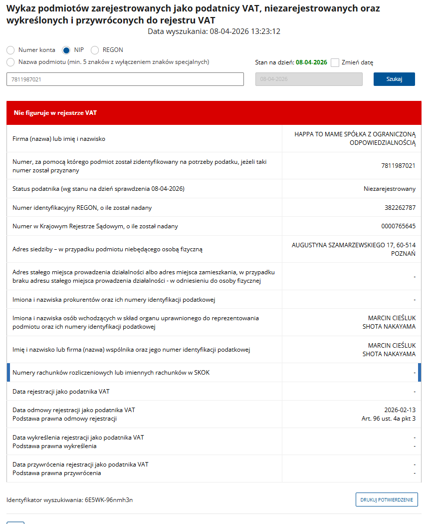 as not registered as of 8th April 2025 (Company NIP: 7811987021). This